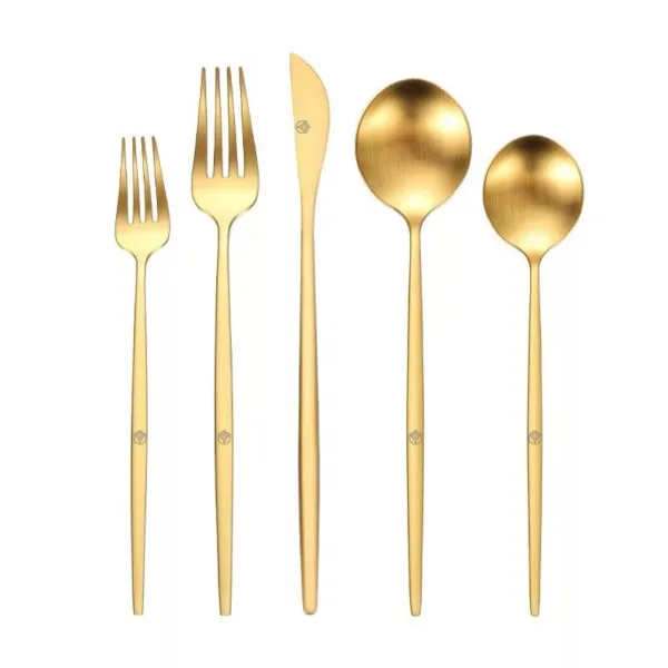 - The Gold Matt Flatware brings a refined touch of understated luxury to your celebration, elevating every table it graces with a soft, sophisticated glow. Its brushed gold finish exudes warmth and elegance, creating a tablescape that feels timeless yet contemporary, perfect for weddings, galas, and intimate gatherings where every detail matters. Each piece feels balanced and thoughtfully crafted, turning each course into a moment of beauty and intention. Imagine your guests gathering around tables where this flatware glimmers softly under candlelight, its gold tones complementing lush floral arrangements and elegant linens, adding a layer of richness that enhances the ambiance of your event. This flatware is more than a utensil; it is a reflection of your dedication to creating a cohesive, luxurious experience for your guests. With every bite, the Gold Matt Flatware quietly underscores the beauty of your event, transforming dining into a refined ritual that leaves a lasting impression. Let your tables tell a story of warmth, care, and elegance with this stunning addition to your event decor.